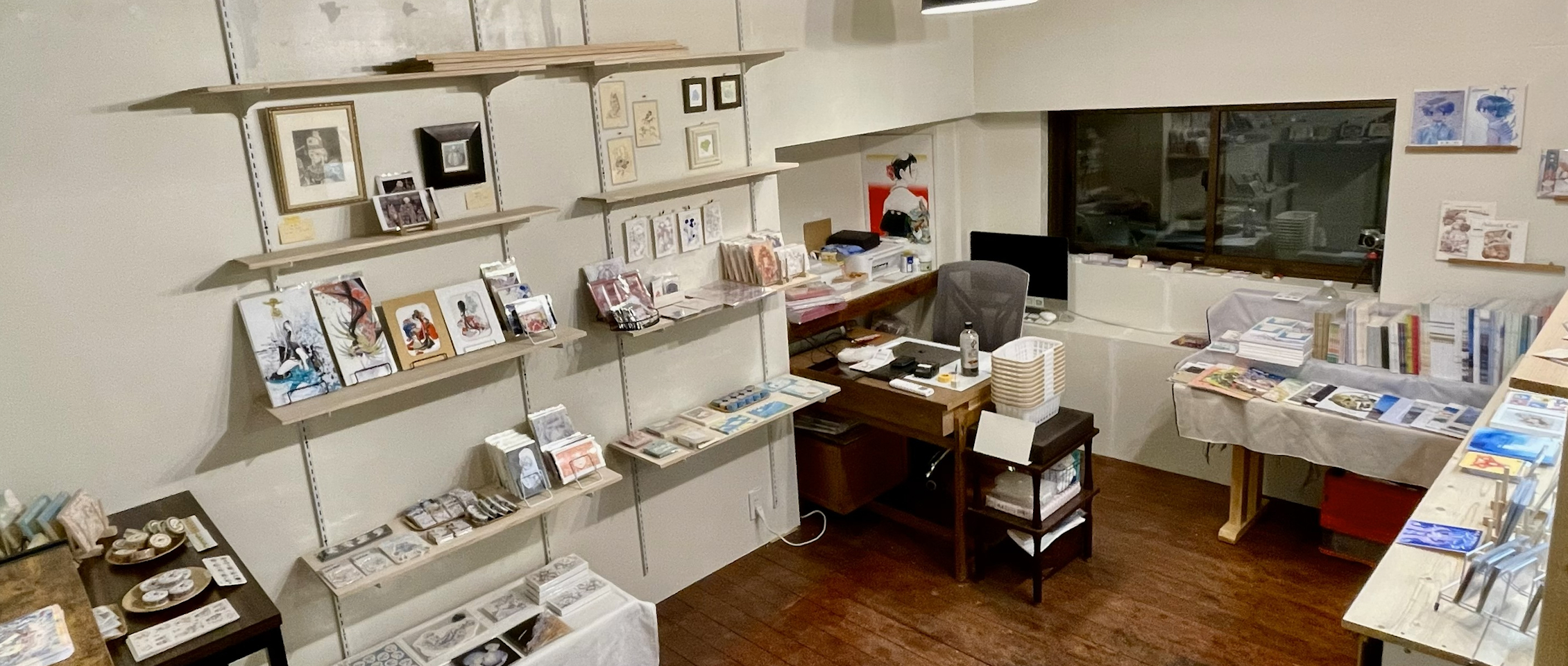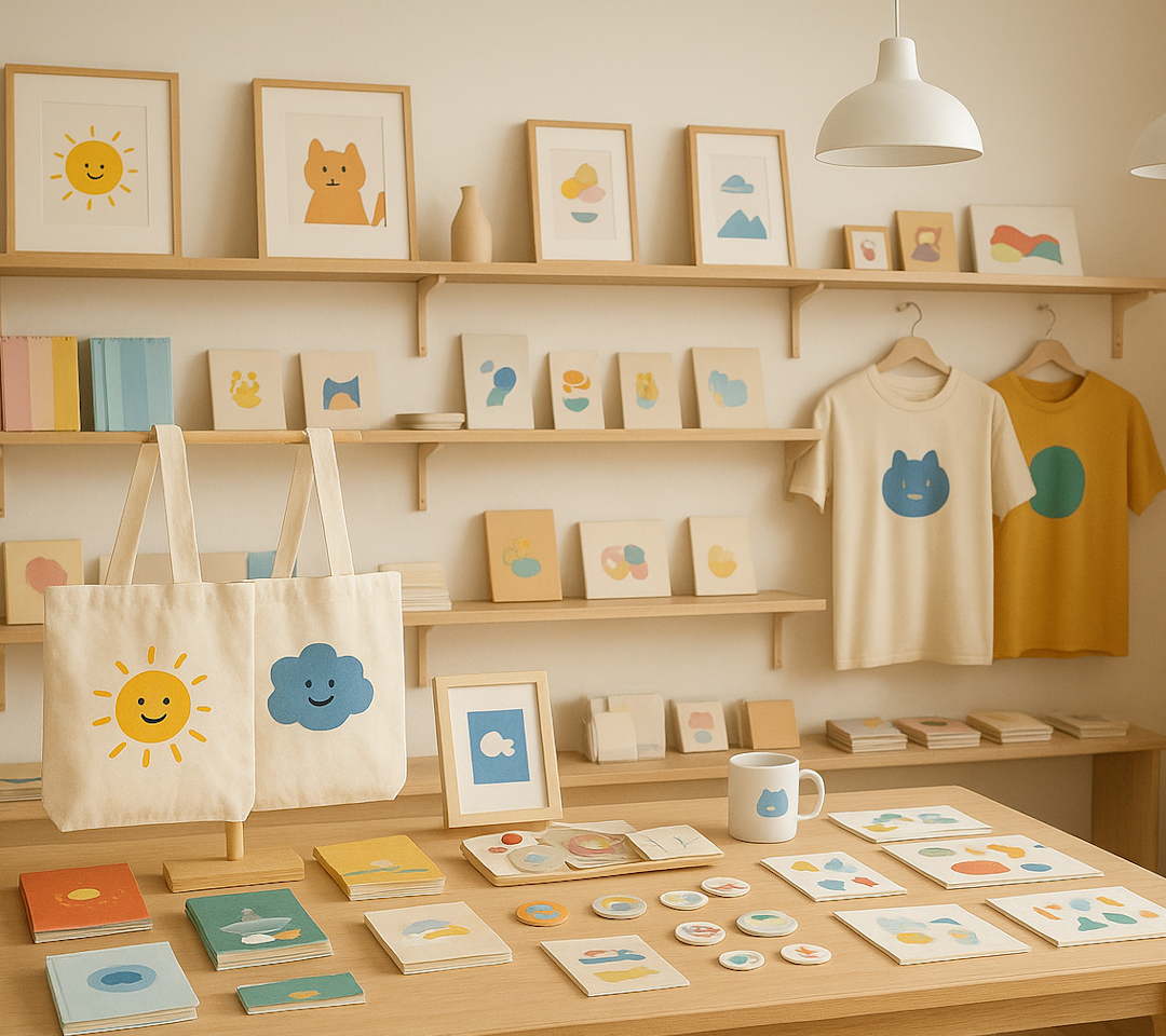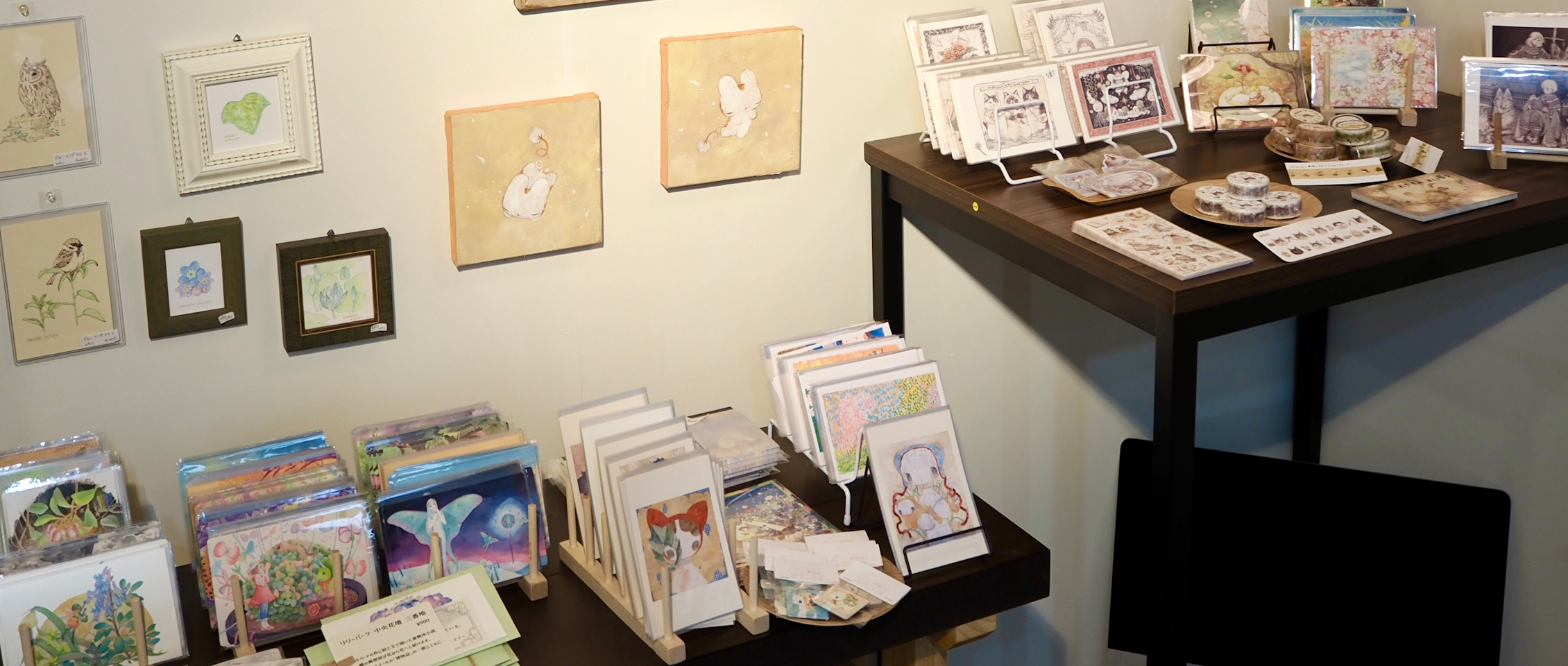 ポストカード、ステッカー、そしてイラスト集など、様々な作品を会場にて展開しています。ぜひお手にとってご覧ください。
