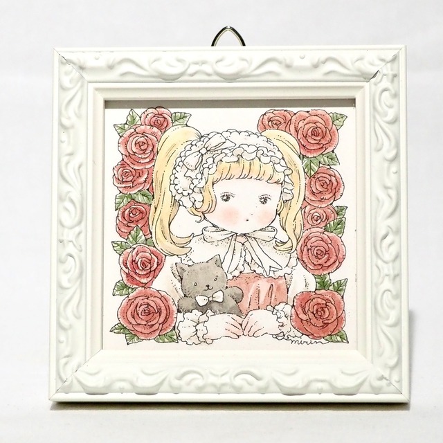 ◆商品説明 白い額縁にやわらかな色彩が映える一枚。 淡いピンクの花々に囲まれた少女と、小さなぬいぐるみが寄り添う姿が、やさしく愛らしい印象を残します。繊細な線と控えめな色づかいが甘さをほどよく抑え、上品なかわいさを感じさせます。壁に掛けることで、日常の中にそっと物語を添えてくれる作品です。 ◆サイズ・仕様 サイズ:縦 約95mm × 横 約95mm 制作年:2025 使用画材:ミリペン、透明水彩 ◆ご注意 手作りの作品のため、既製品のような完全な均一性はありません。 強い衝撃や直射日光にはご注意ください。 写真と実物で色味が多少異なる場合があります。