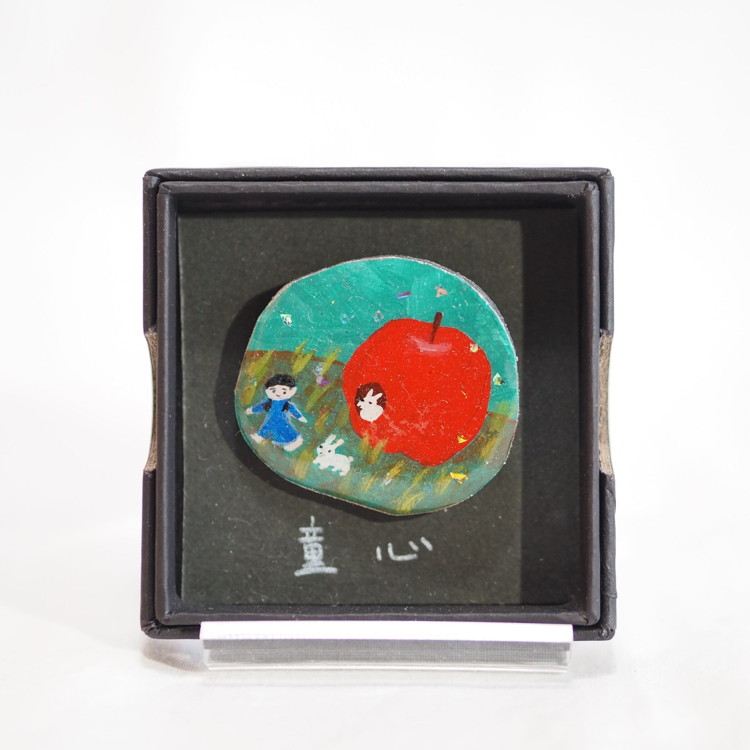 丸い画面の中に、赤いりんごと小さな人物を描いたブローチです。