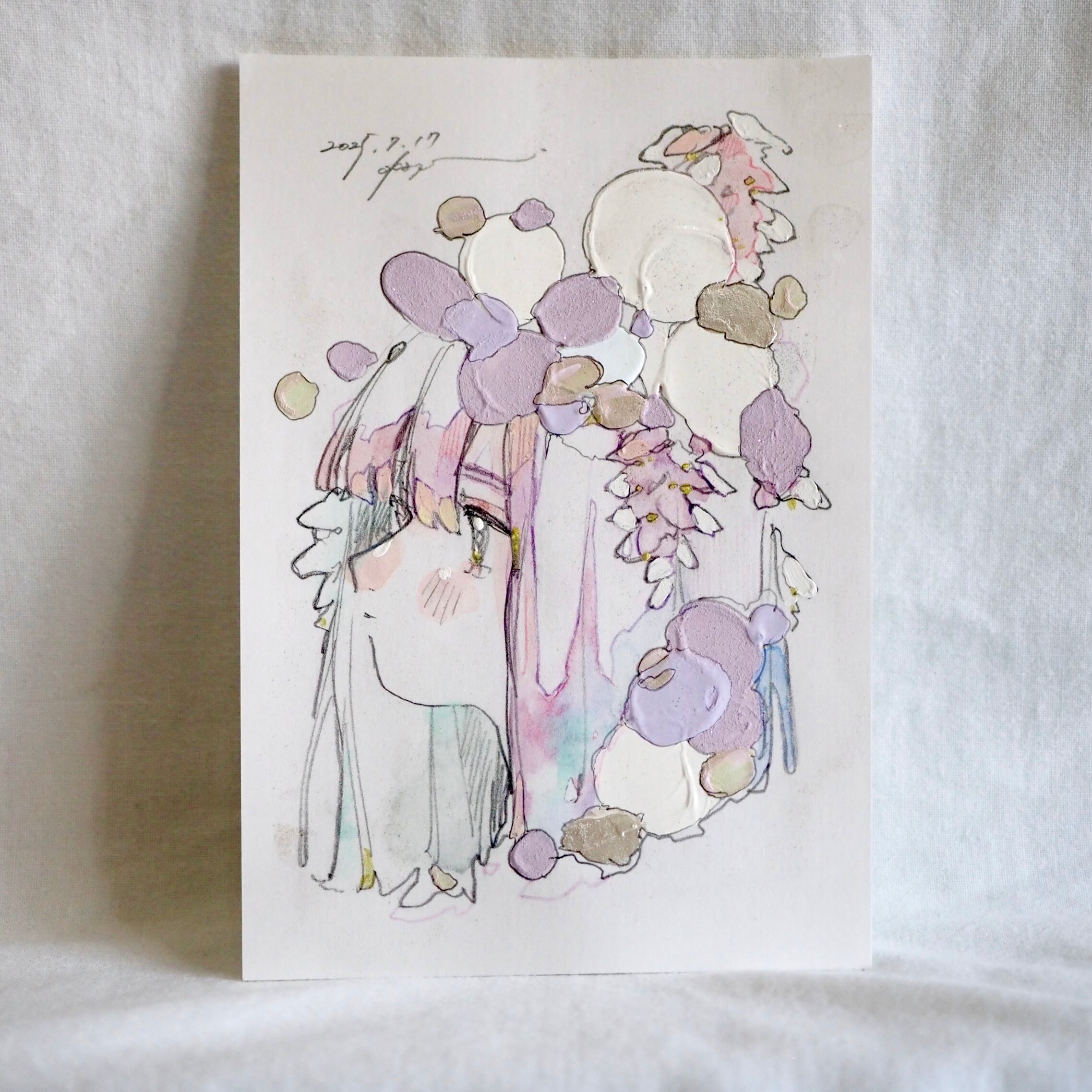 淡いパープルを中心に、白やくすんだ色調が重なり合い、気品をまとっています。