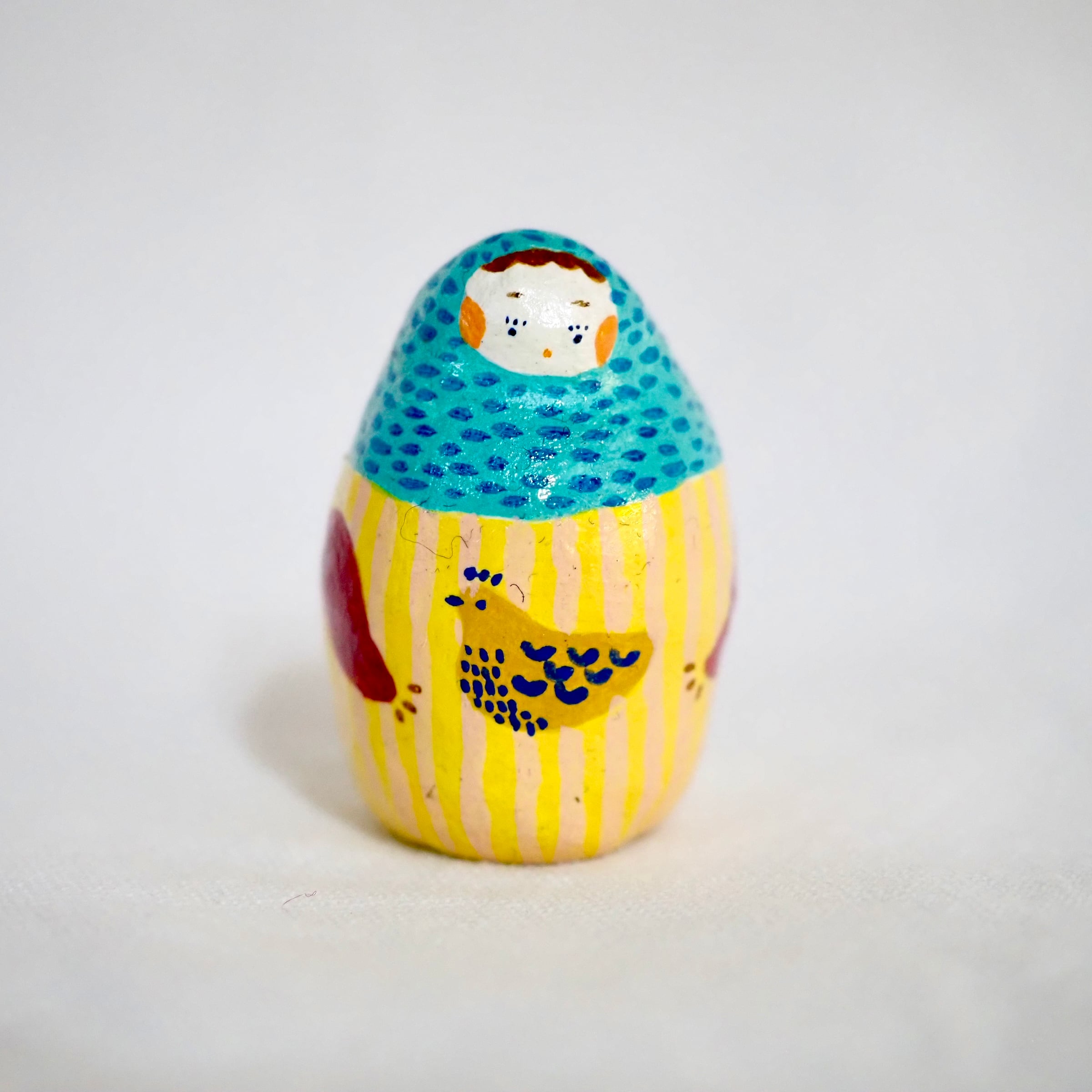 青と黄の色彩が鮮やかに重なり、明るく印象的な存在感を放ちます。胸元にそっと抱えられた鳥と、なんともいえない表情が、守るようでもあり寄り添うようでもある情景を生み、思わず頬がゆるんでしまう可愛らしさがあります。親指ほどのサイズながら、想像するのが楽しい一点ものです。