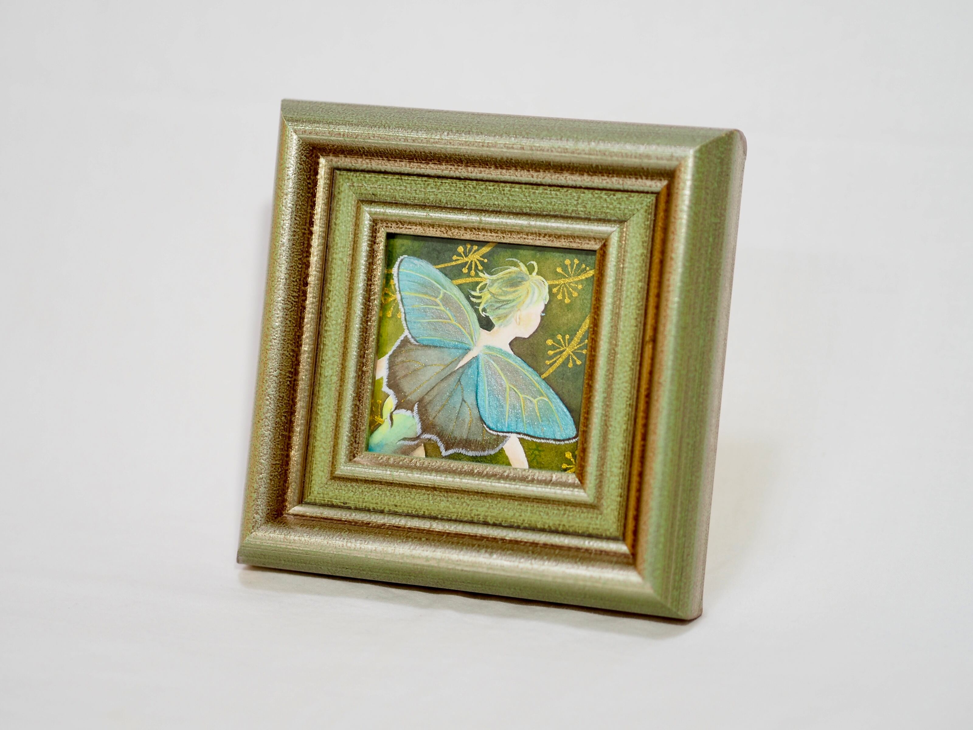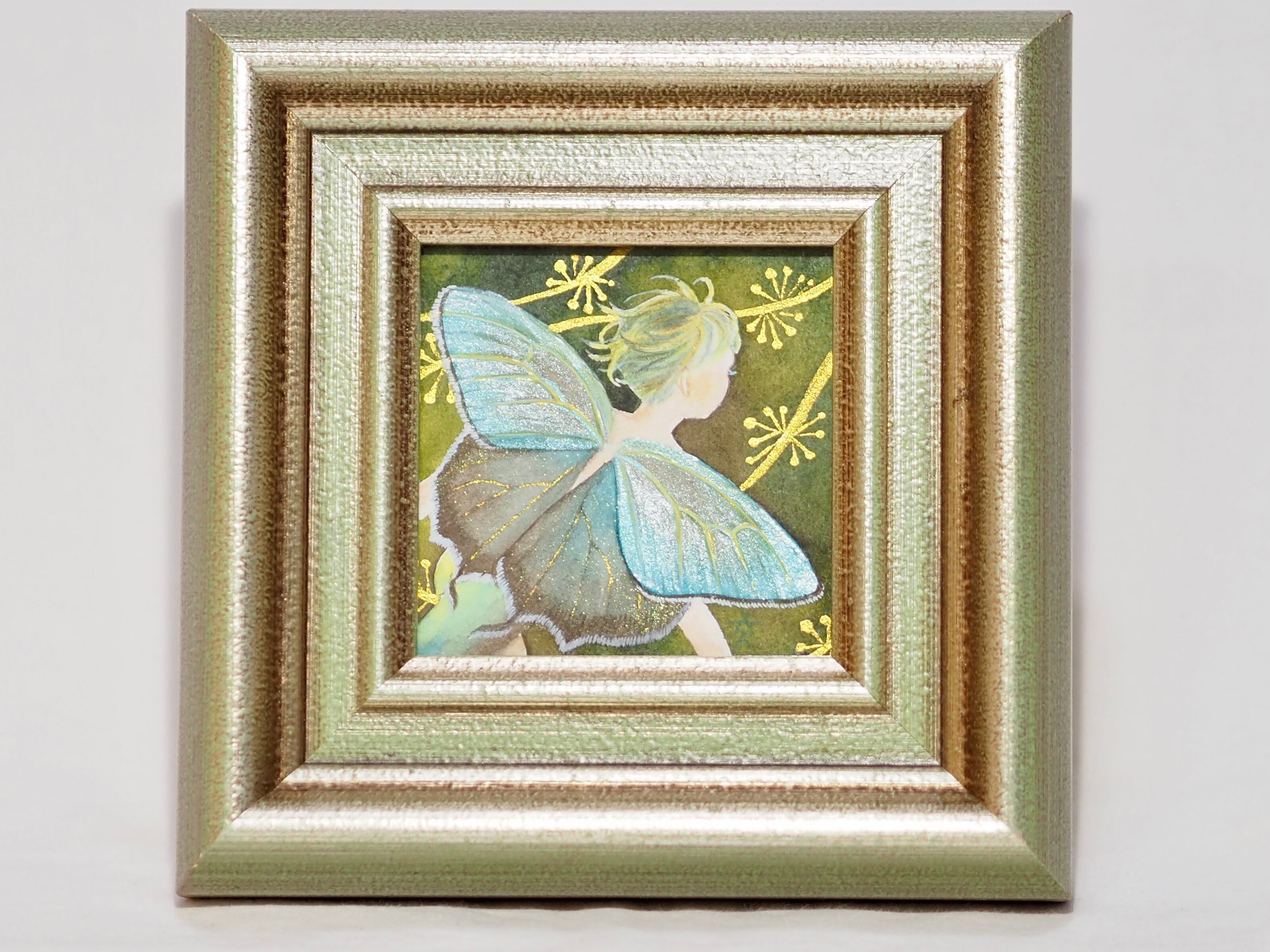 重なり合う翅の質感や繊細な線が、光を受けてやわらかく表情を変え、奥行きのある印象を生み出します。金色の装飾がさりげなく散り、自然の中にひそむ気高さと幻想性を添えています。可憐さと落ち着きが共存する作品です。