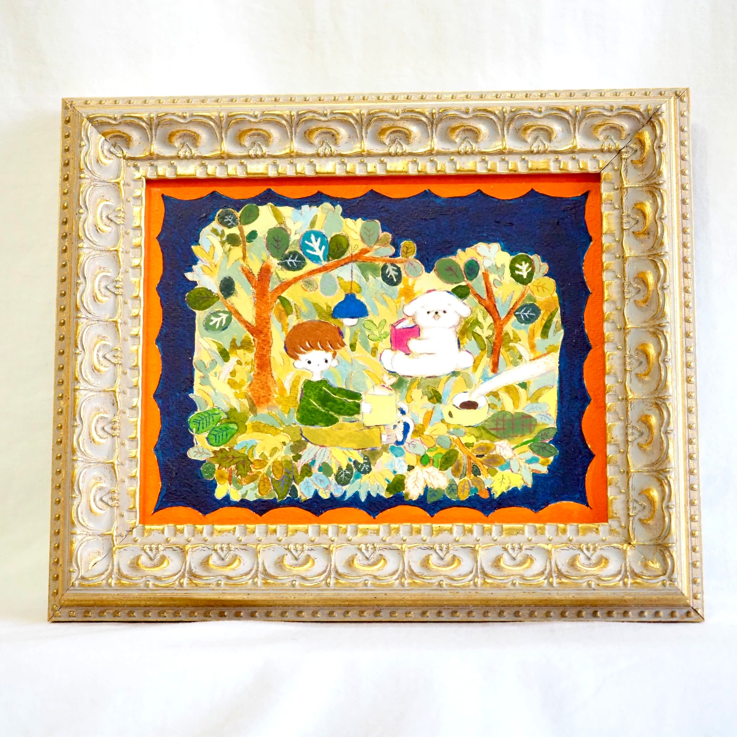 人と白い犬が、それぞれ思い思いの時間を過ごしています。読書をしたり、くつろいだりする姿や、カップから立ちのぼるコーヒーの湯気が、外の世界から切り離された心地よさをそっと伝えます。気持ちがほっこりするような、穏やかで満たされたひとときを感じる作品です。