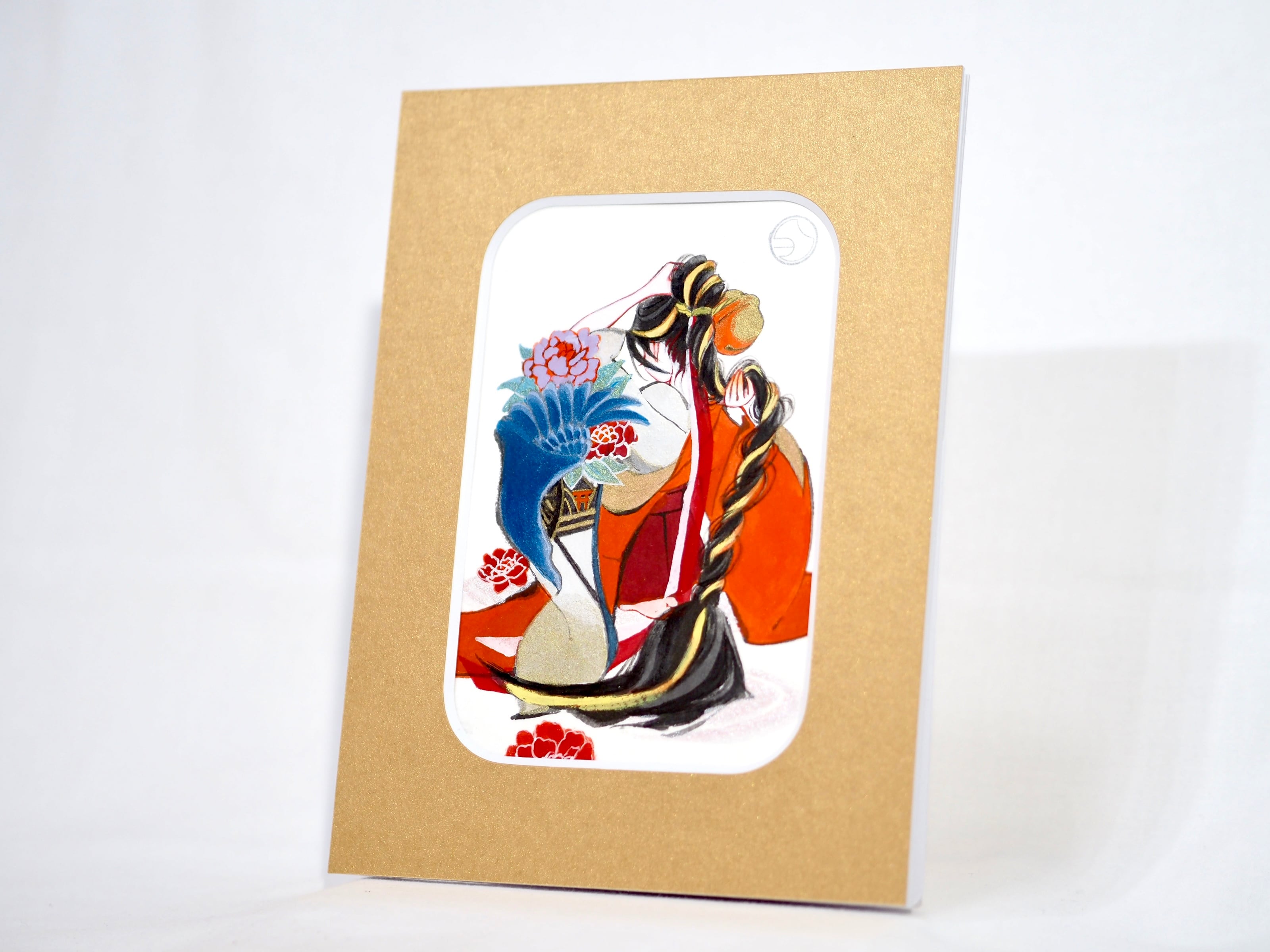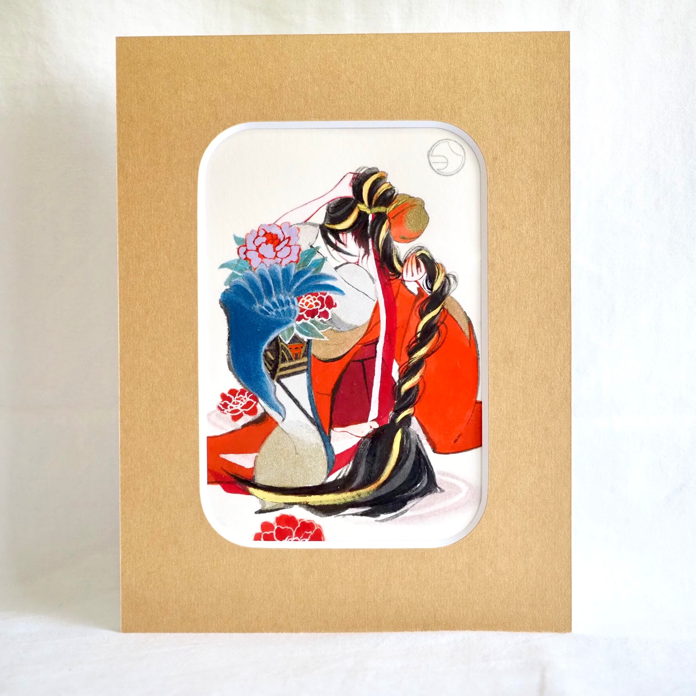 流れるような髪の線や、衣の重なりに施された金のきらめきが、祈りの時間をそっととどめます。表情を見せない佇まいと、髪に触れる仕草が内面の静かな揺れを伝え、願いを胸に秘めたひとときが凛とした気配で立ち上がる作品です。