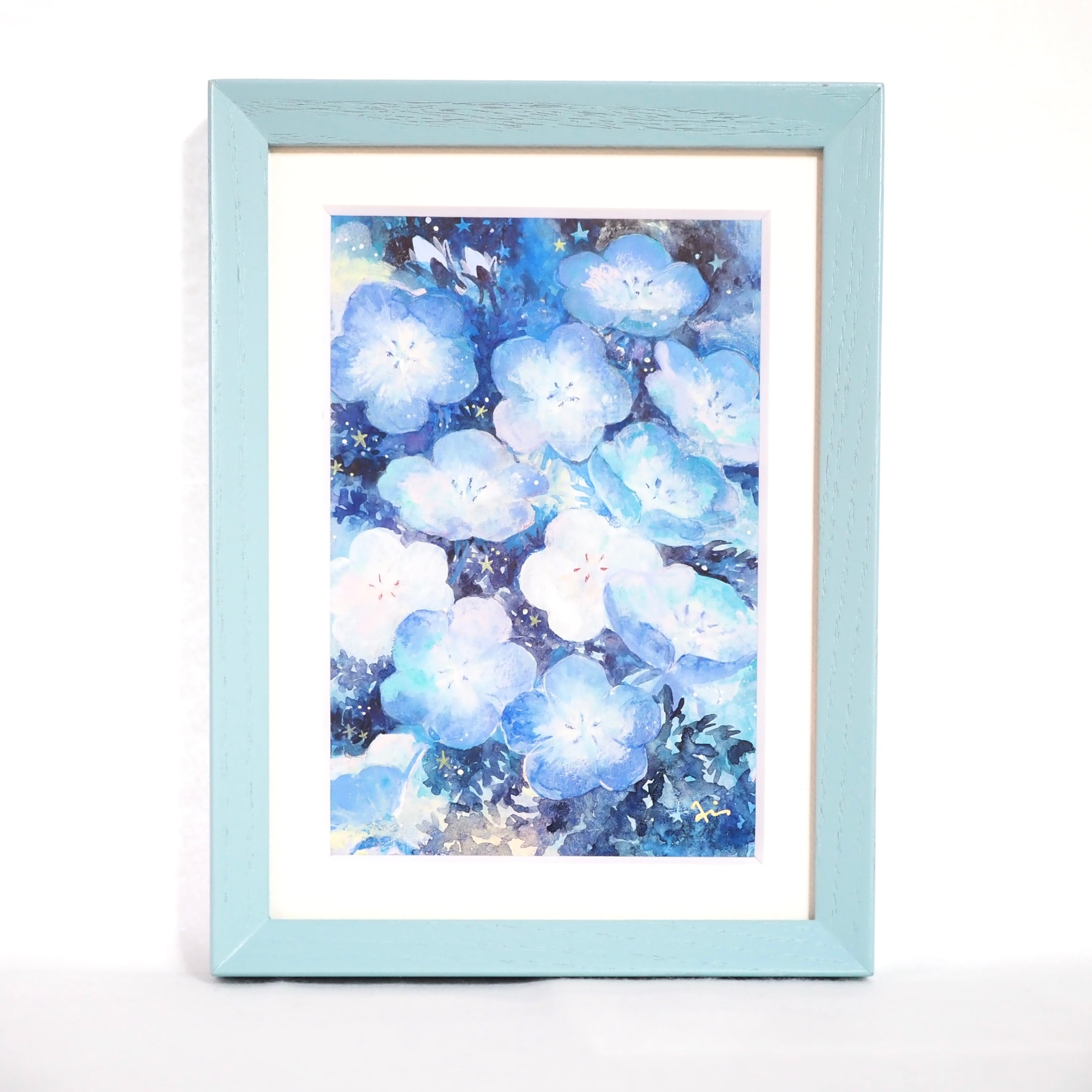 淡い水色から深い青へと溶けていくグラデーションの中に、ネモフィラの花がふわりと浮かび上がります。