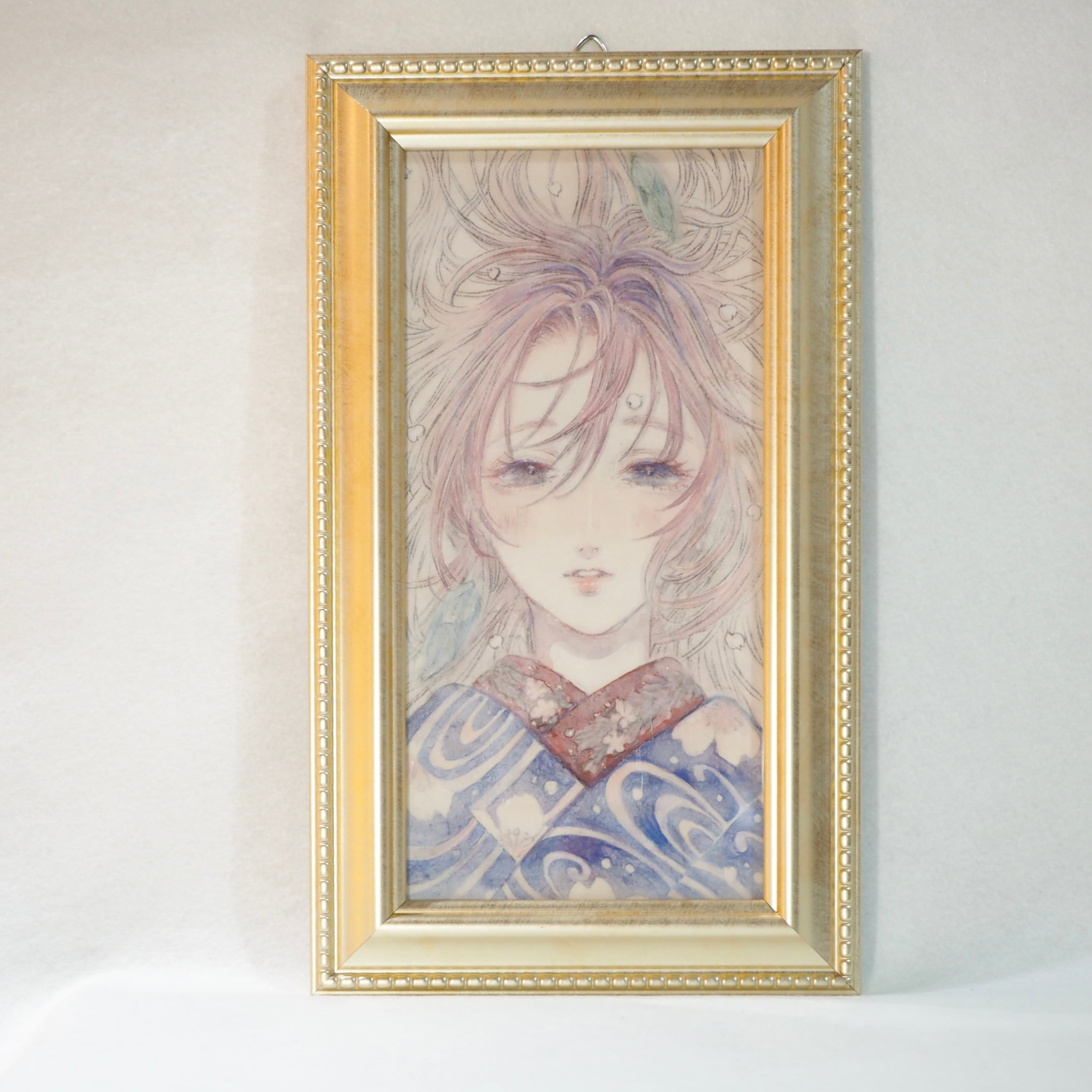 女性のやわらかな視線と、わずかに開いた口元は、想いを告げる前の、言葉になる前の瞬間をとらえているかのようです。髪は水にほどけるように流れ、花びらと溶け合っていきます。